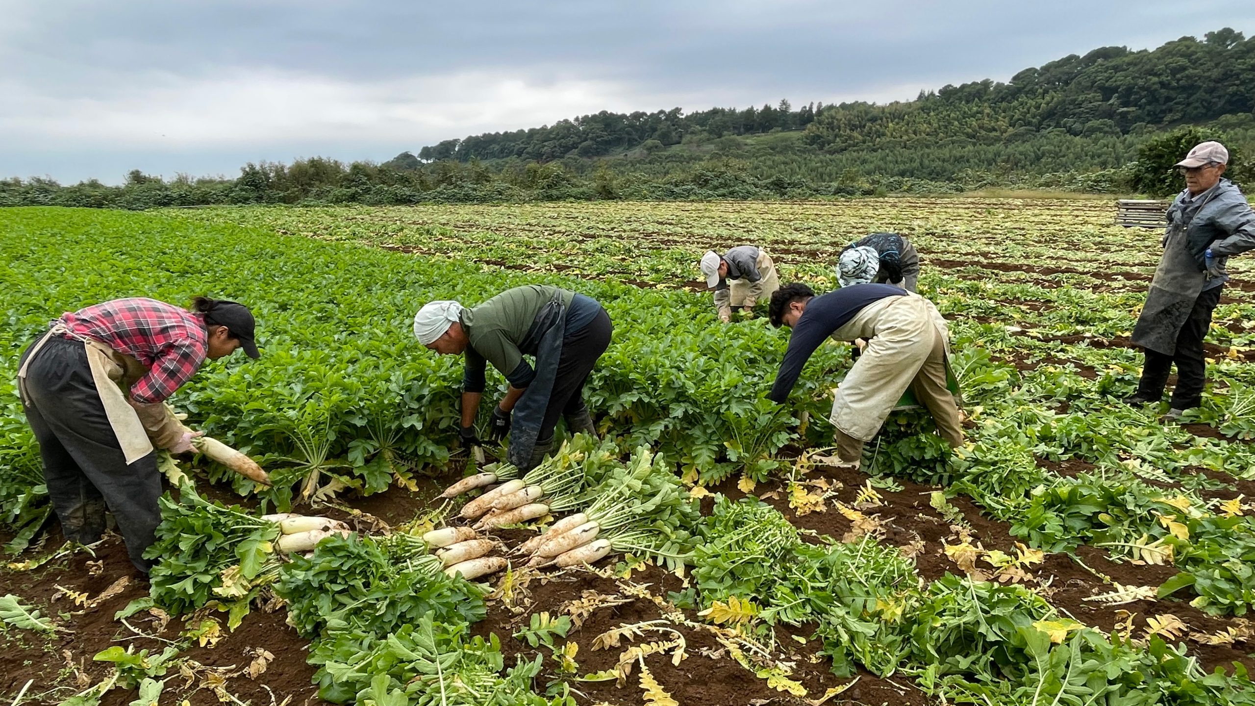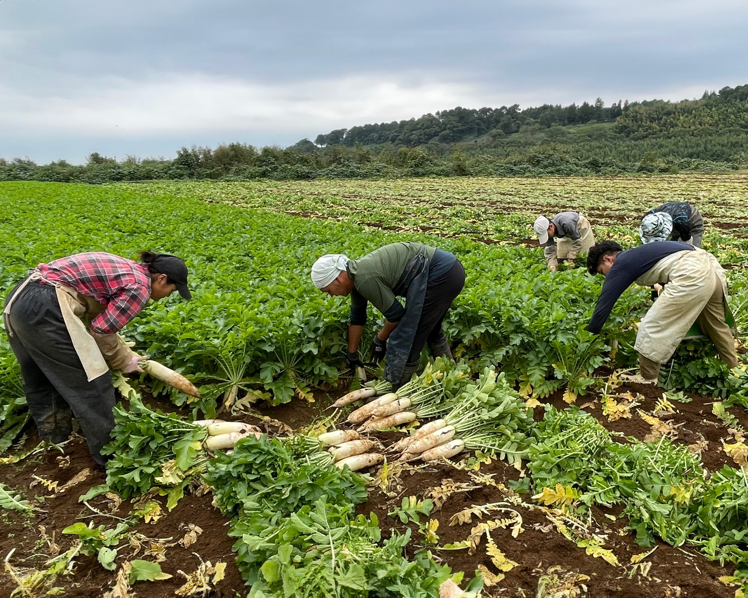 収穫は、気温が高くなる前の早朝から行います。大根は、収穫して時間が経つと土が落ちにくくなり、大根の色が悪くなるので、収穫をした後は、素早く洗浄作業場へ運びます。