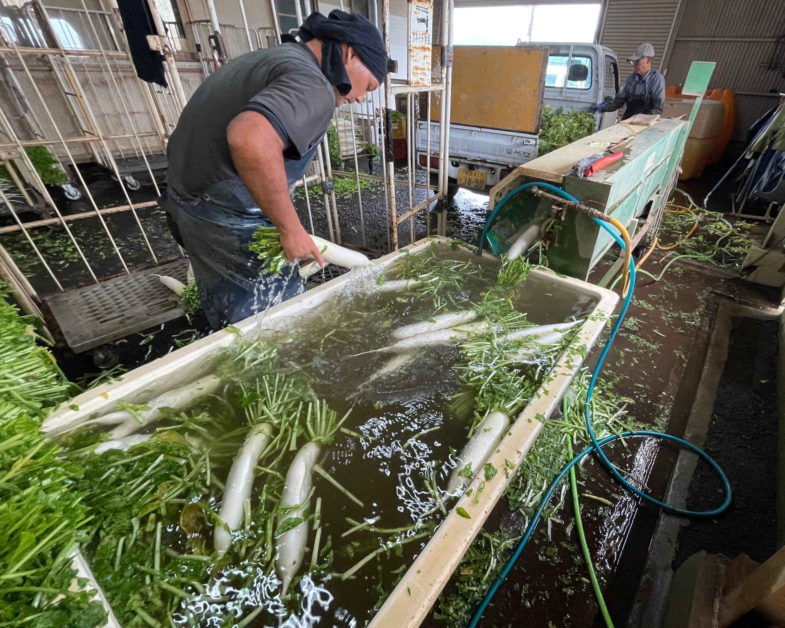 専用の機械を使って大根を洗浄します。機械では落としきれない土汚れがついた大根や折れた大根を手作業で選別をします。また、大根のひげ根も、残っていると見た目が悪いのでしっかりと除去していきます。