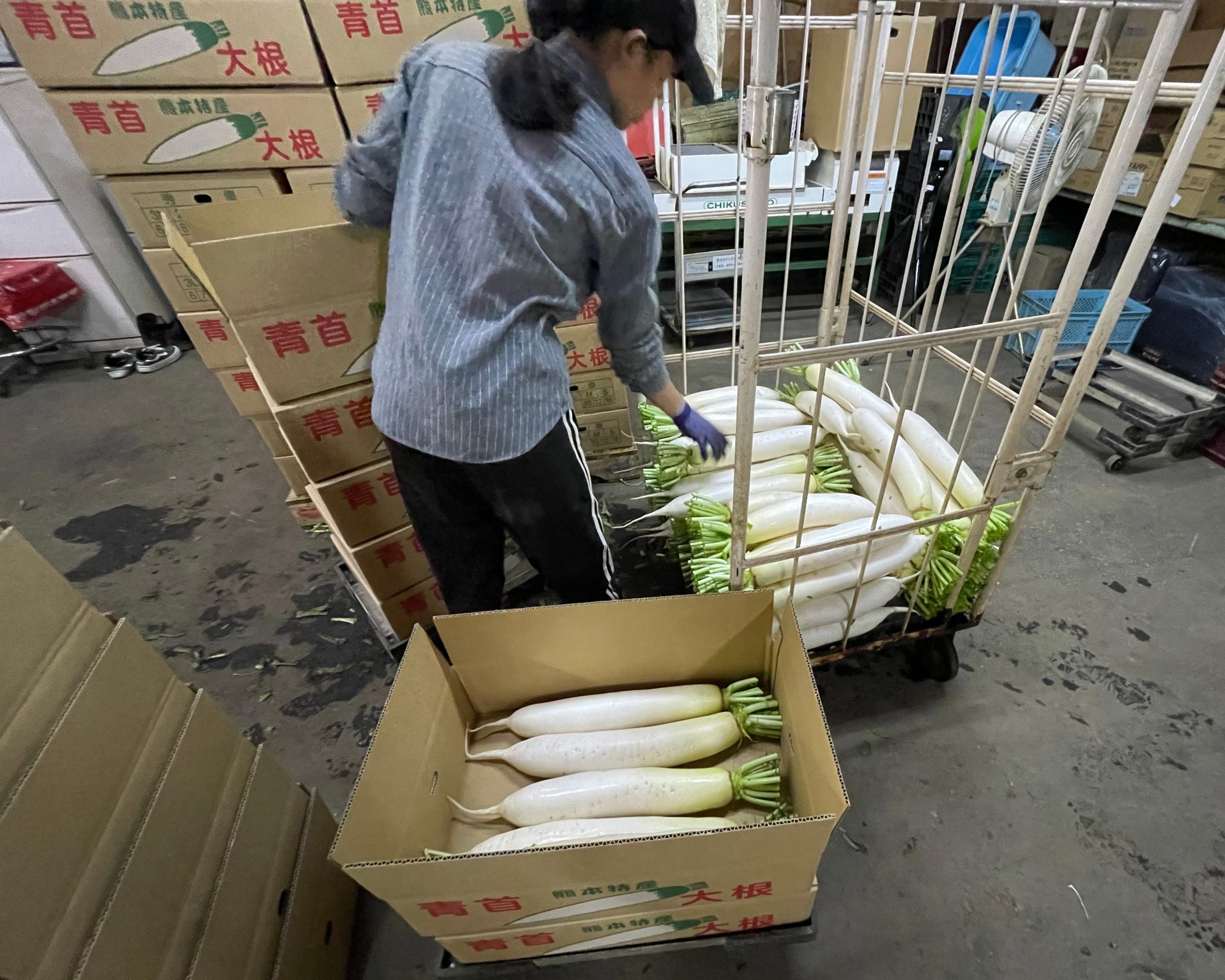 箱詰めの際、割れていたりなど商品にならない大根を再度、検品しながら箱詰めを行います。大根は輸送中に折れやすいので、大根が動かないように綺麗に詰めることを徹底しています。