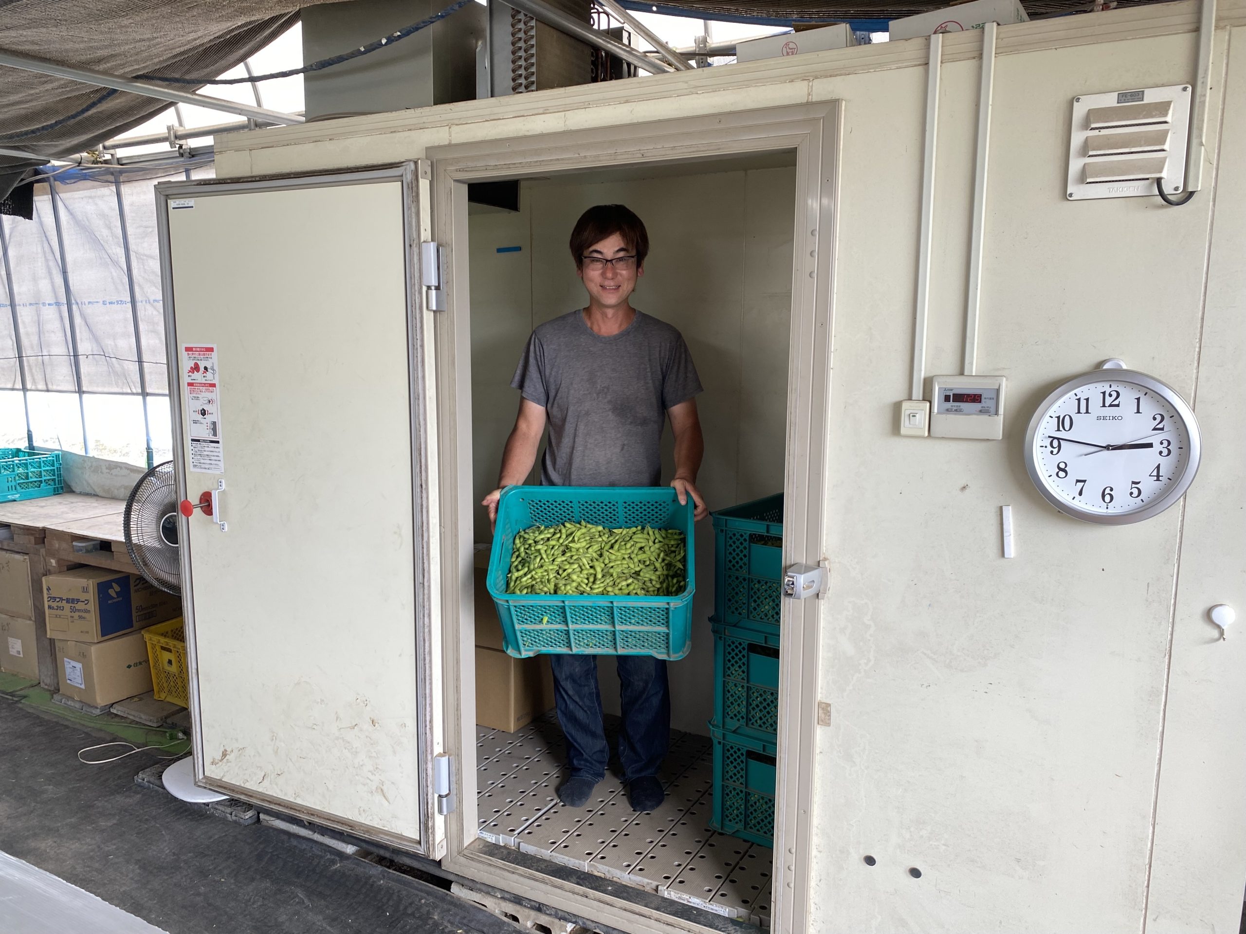 枝豆を収穫後に素早く冷蔵庫内でしっかりと冷やしこみを行います。枝豆は、収穫後も呼吸を続けるため、枝豆自身の糖分を消費してしまい、食味が悪くなりますが、冷やしこみを行うことで呼吸量が抑えられ、糖分やうまみ成分が減ることを防ぐことができます。