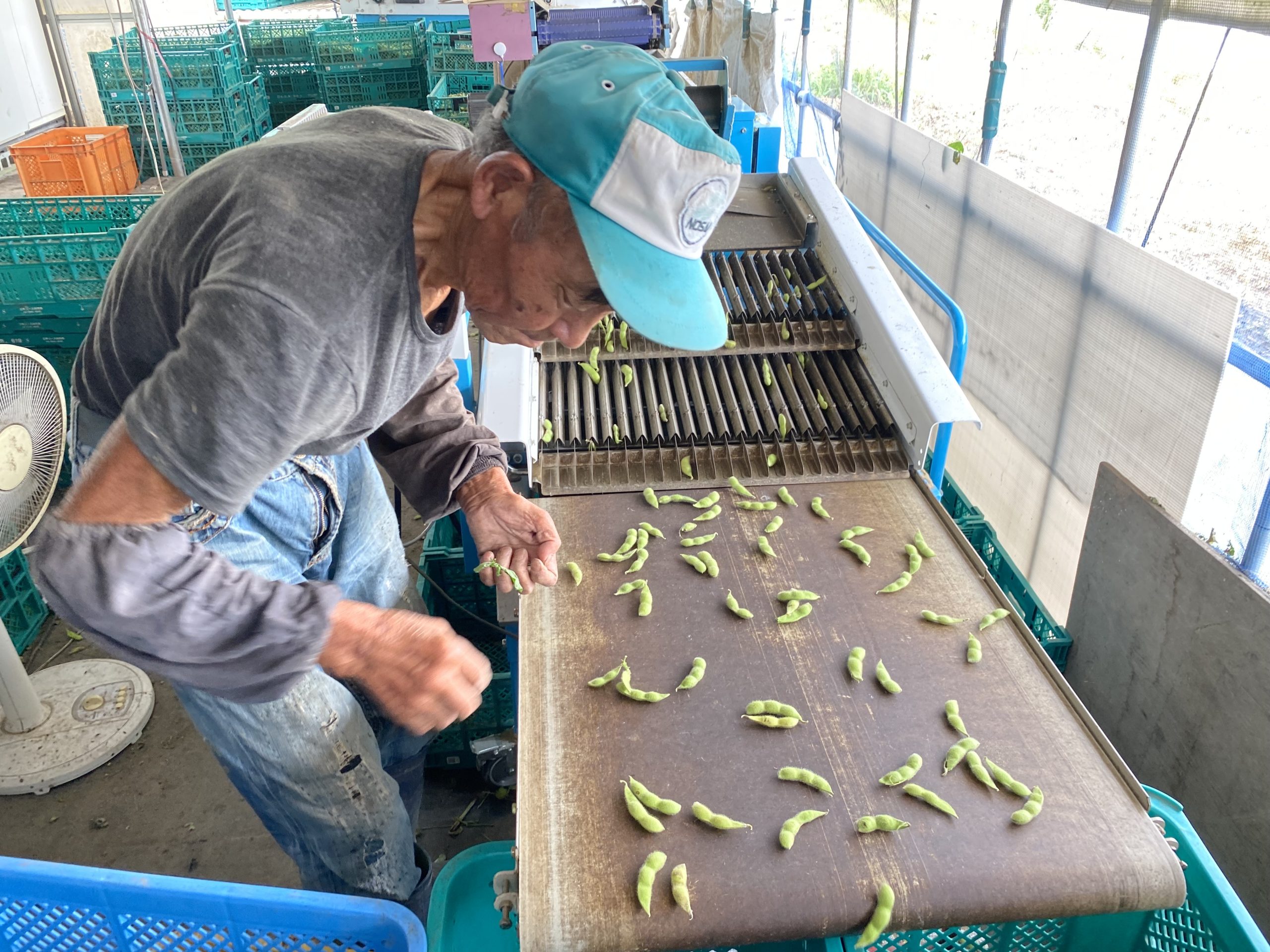 収穫後は、枝と豆を分ける脱莢(だっきょう)という作業を行います。脱莢(だっきょう)した後に枝豆の選別を行います。未成熟のサヤなどが混入していないか機械で選別し、最終選別は手作業で丁寧に行います。