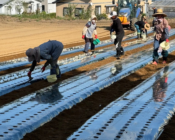 土づくりをした後は植え付け作業になります。雑草防止対策としてマルチシートを張り、1片ずつ手作業で丁寧に植え付けていきます。にんにくが健全に育つためには、植え付ける向きと深さが重要です。