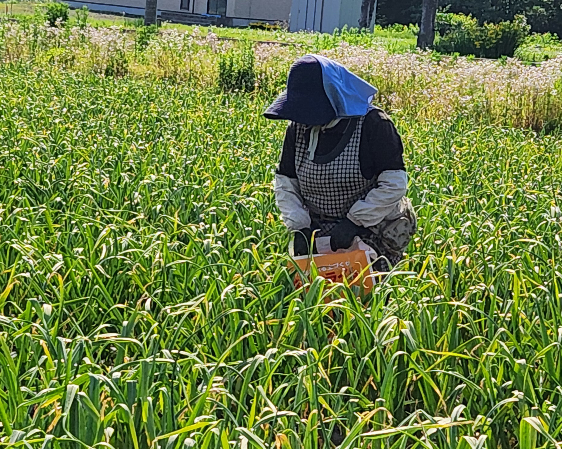 にんにくの球の方へ栄養分をたくさん与えて、より良質で大きなにんにくに育てるために「芽摘み」を行います。「芽摘み」とは、にんにくの芽となる部分を1本1本、手作業で摘み取っていく作業のことです。