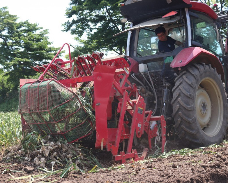 長い期間をかけて大切に育てたにんにくは、畑ごとの生育状況を見極めて収穫を行います。収穫には、にんにく専用の収穫機を使用し、効率よくスピーディーに作業を行っていきます。