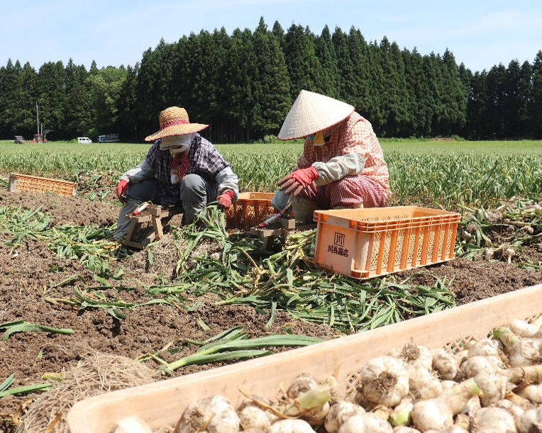 収穫したにんにくの茎と根を一本づつ切り取り、コンテナに入れた後、乾燥施設で運び乾燥させます。にんにくは、水分をしっかり抜くことで日持ちが良くなり、風味と品質を保つことが出来ます。