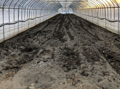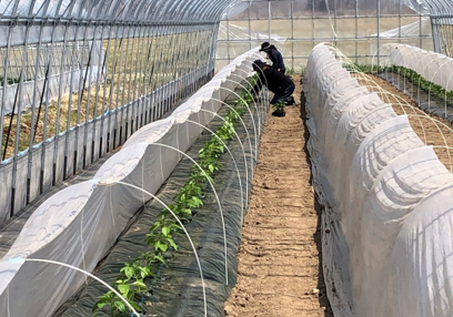 苗を畑に定植していきます。地中にしっかりと根を張ることができるように、土壌の水分や地温の確保をするためにマルチシートを張ったり、ビニールをトンネル状に覆うトンネル作りをしています。