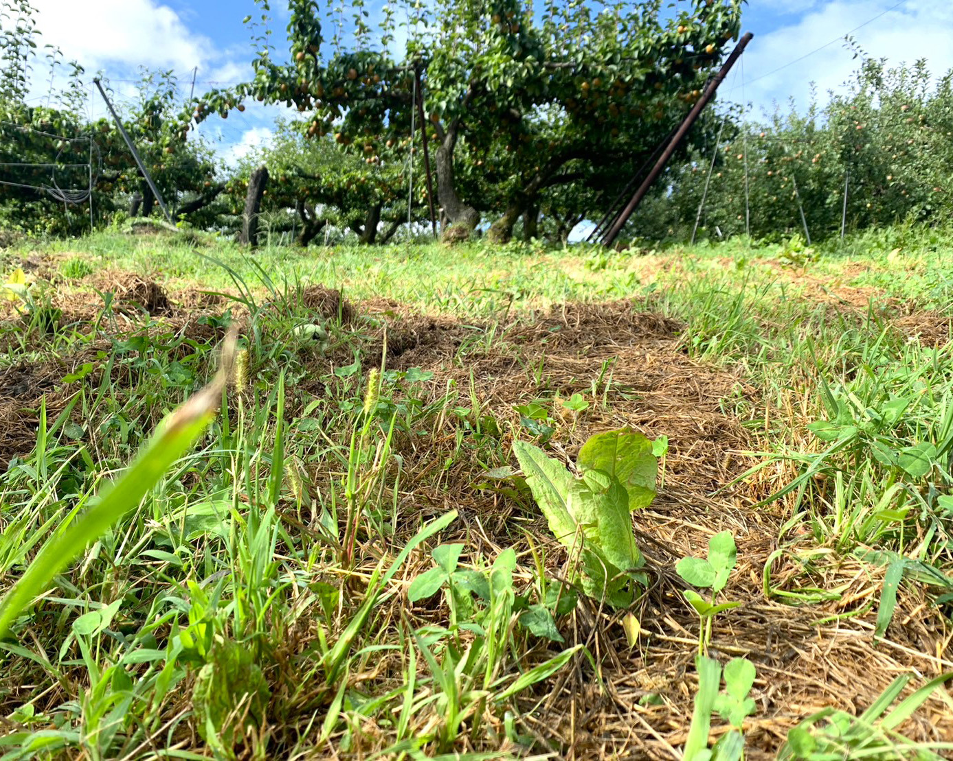 土壌中の菌を育てるため、除草剤は一切使用せず、雑草も土の栄養に変えていく「草生栽培」を実践しています。雑草も管理が必要なため、年に4~5回は園地全体の草刈りを行っています。