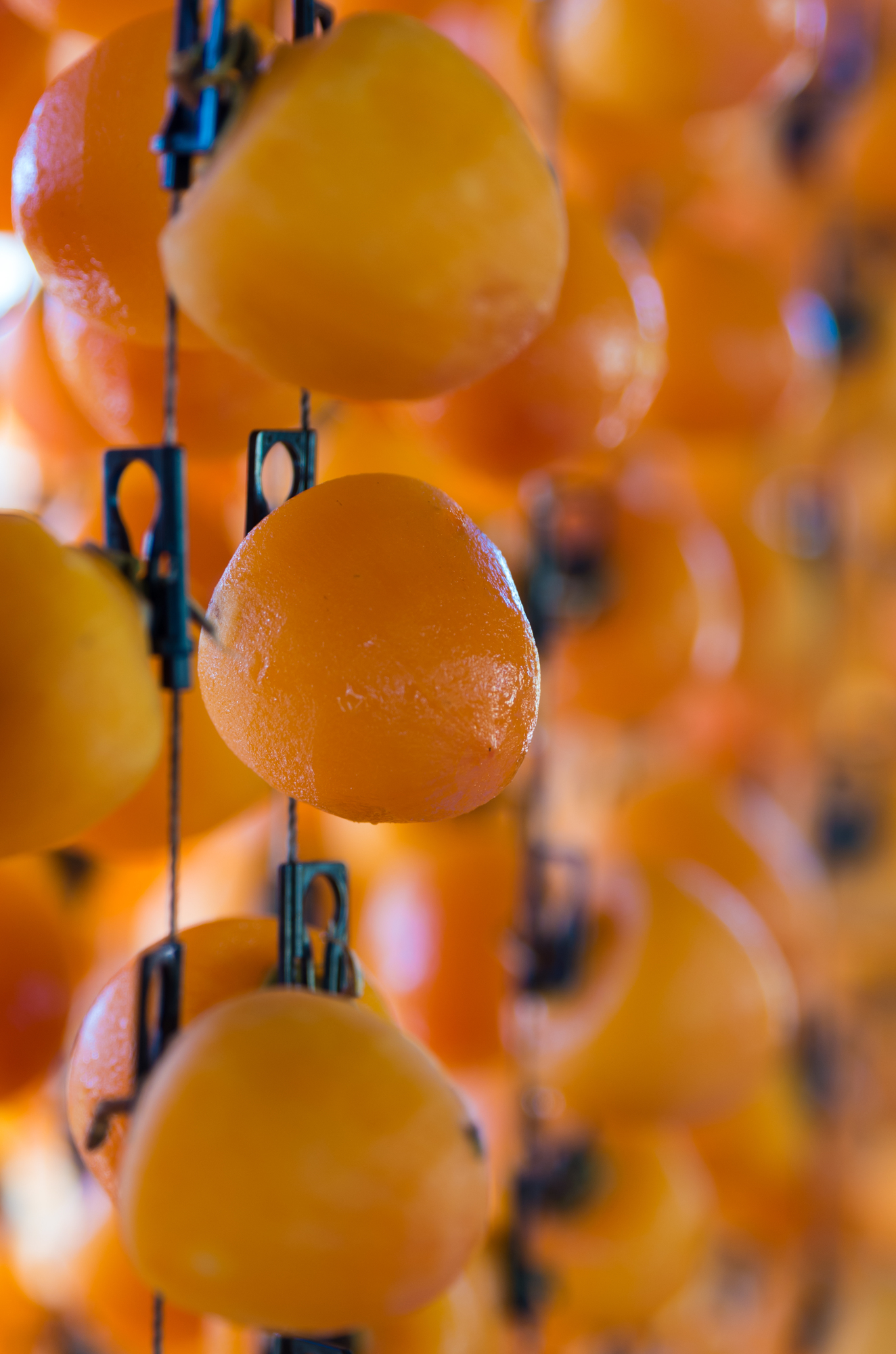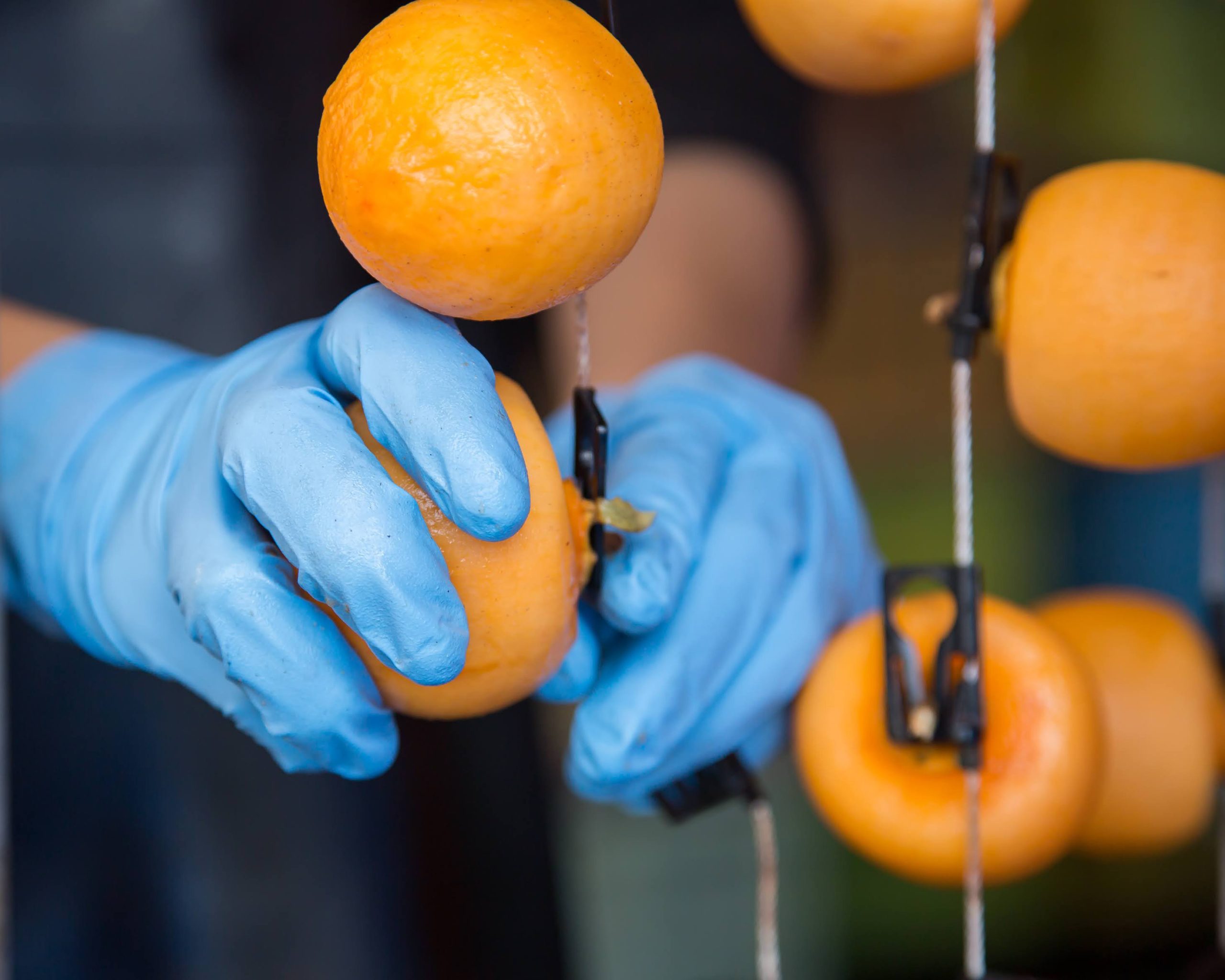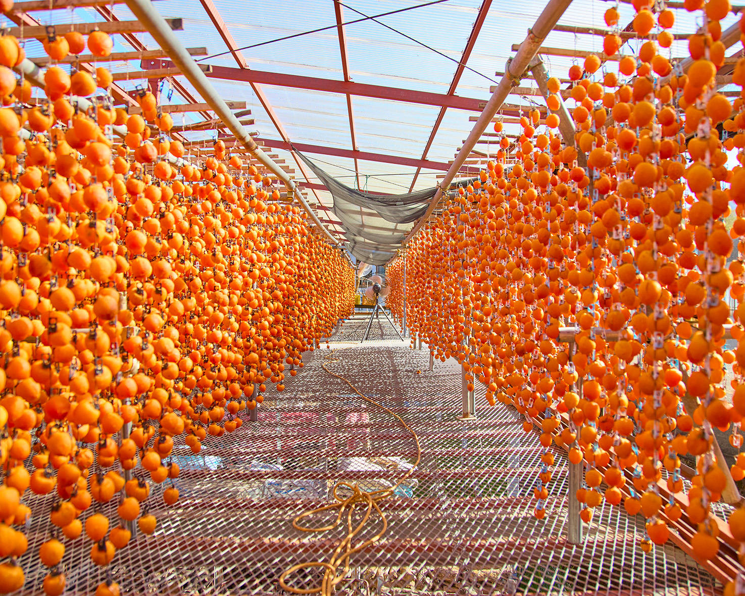 乾燥程度を確認しながら、味や食感にまろやかさを出すため、3日ごとに柿を一つ一つ揉んでいきます。温度、湿度により品質が変わるため、天候に合わせて乾燥させる環境の調整を行います。