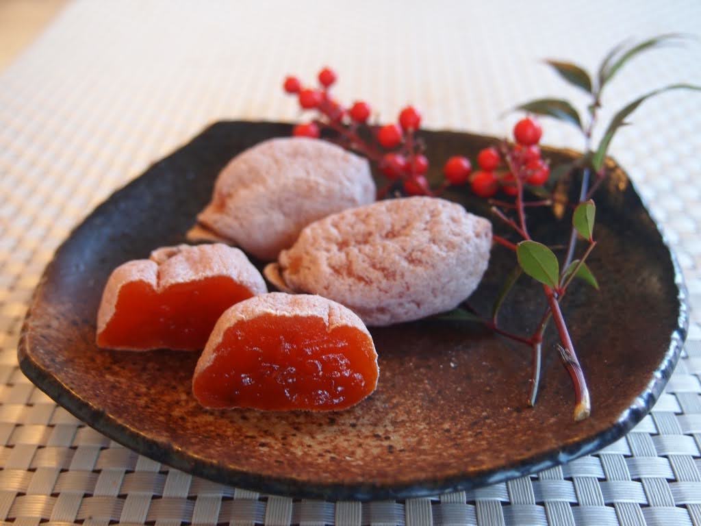 冷たい空気の中でじっくりと乾燥させることで、糖度が増し甘みの強い干し柿になります。表面についた白い粉は、柿の糖分が結晶化したもの。乾燥工程の際に丁寧に揉みこむことで、水分とともにブドウ糖が果実の外ににじみ出て、白い結晶となります。
