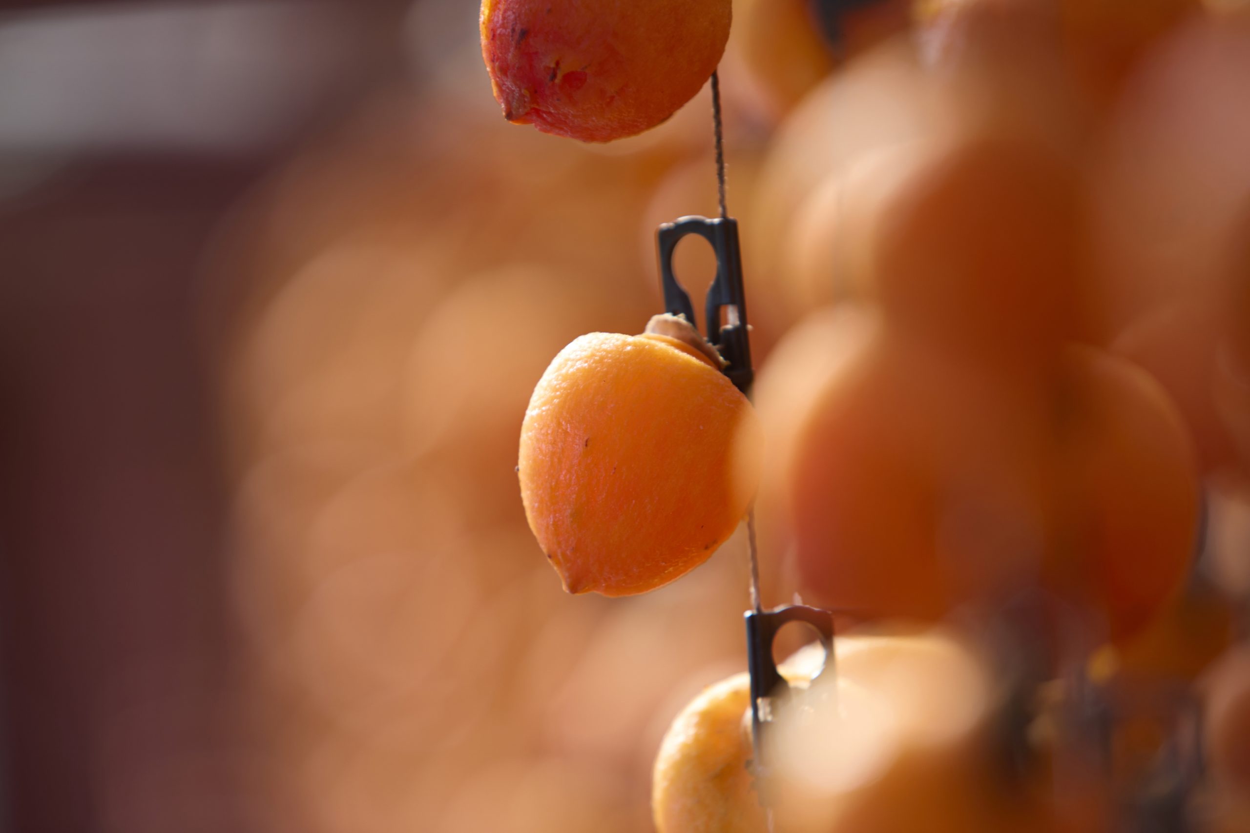 収穫後は、市田柿を丁寧に一つずつ皮をむき、糸でくくりながら簾状にして吊り下げていきます。秋から冬にかけて、カネシゲ農園は市田柿のオレンジ色に染まります。
