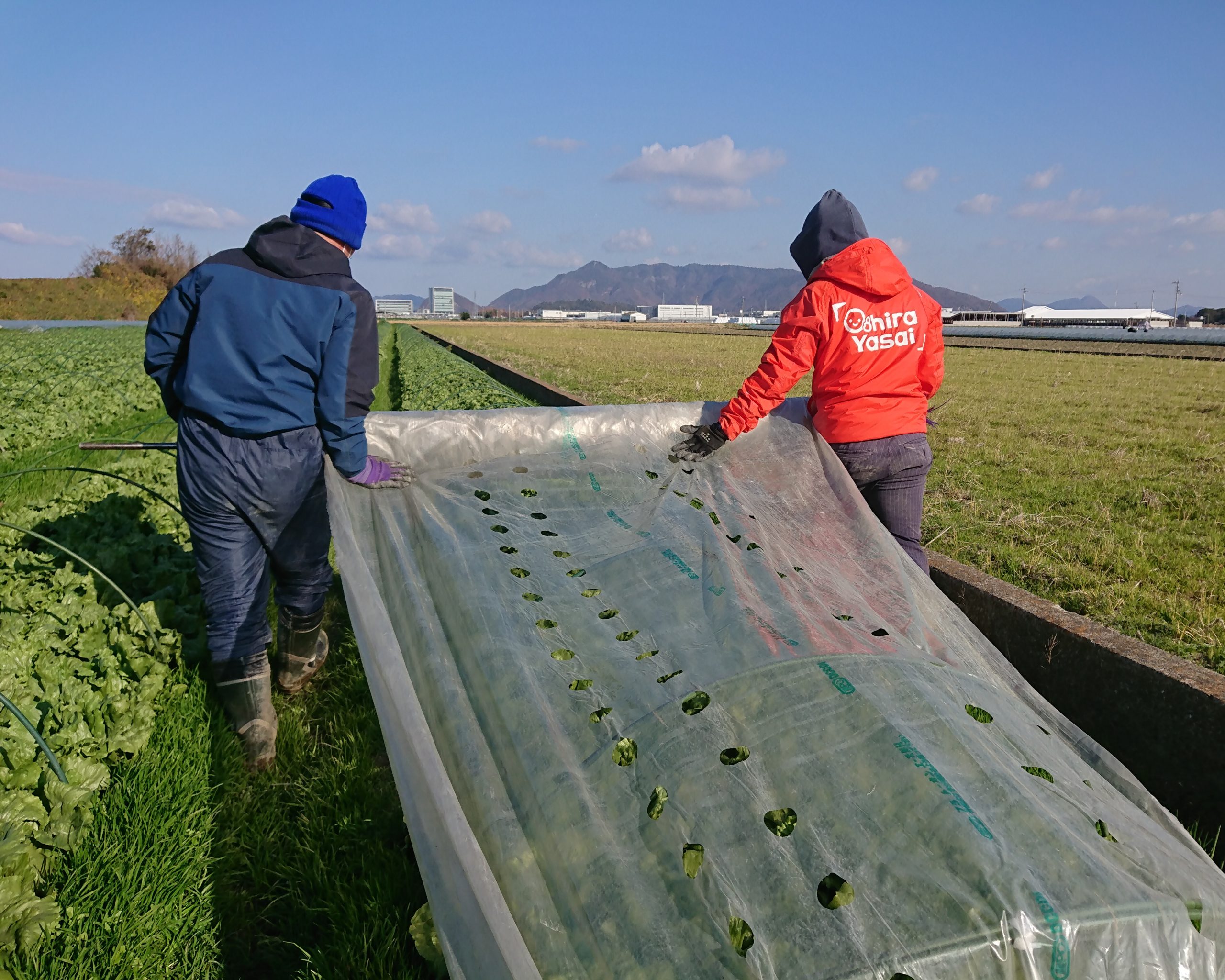 寒さや霜、害虫などから苗を守るために、ビニールシートをかけて保護します。日中の温度を保ち、夜間の冷え込みを防ぐことで、レタスが順調に結球し、元気に育つ環境を整えます。