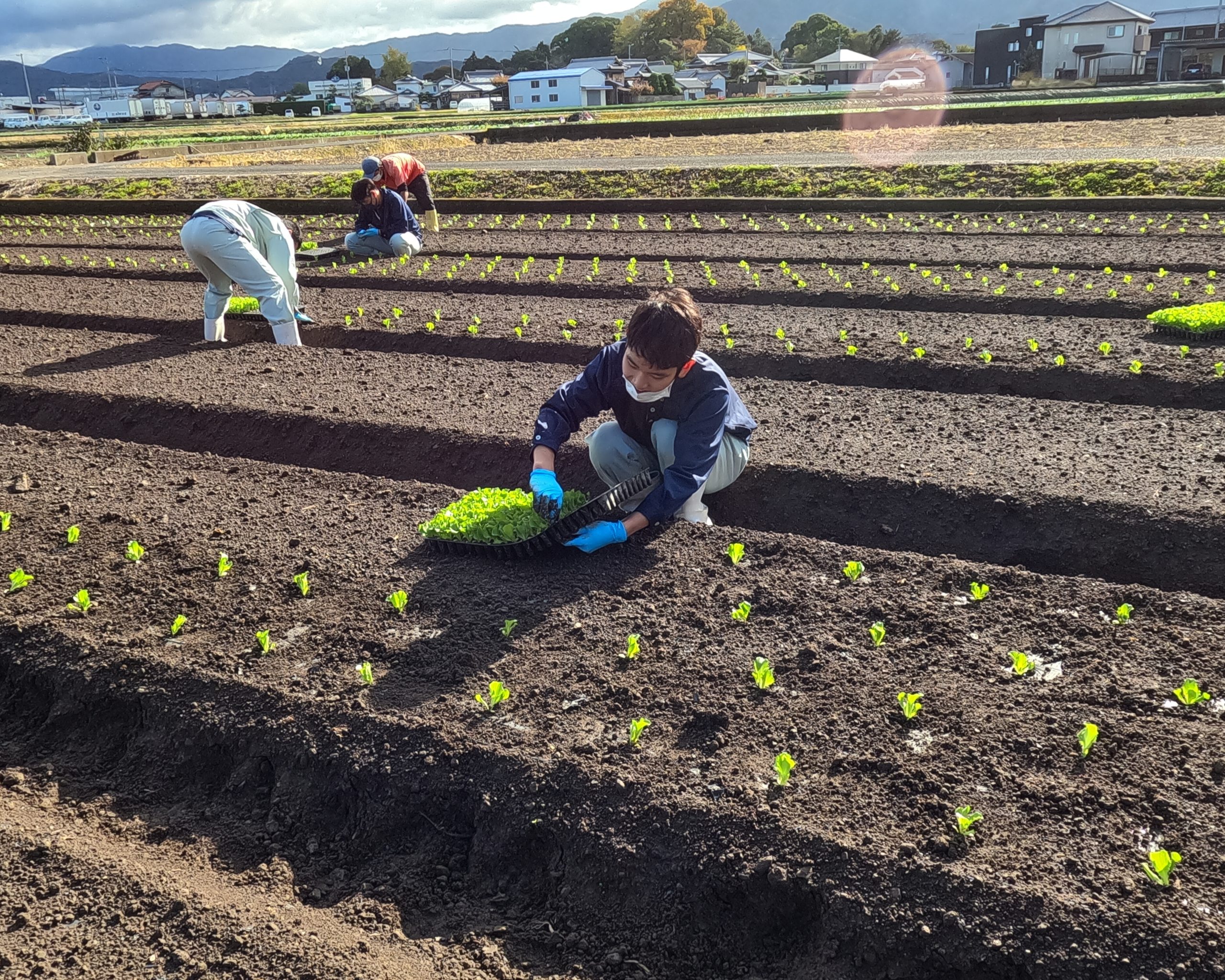 元気に育った苗を手で1本ずつ丁寧に植えていきます。根を傷めないように間隔をとり、風通しをよくします。天候や温度を見ながら最適な時期に植えることで、生育のばらつきを抑えます。