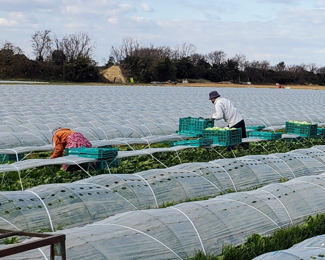球がしっかり巻き、葉につやと弾力が出たタイミングで収穫します。1玉ずつ丁寧に根元をカットし、形や色を確認しながら選別します。鮮度を保つため、素早く収穫作業を行っていきます。
