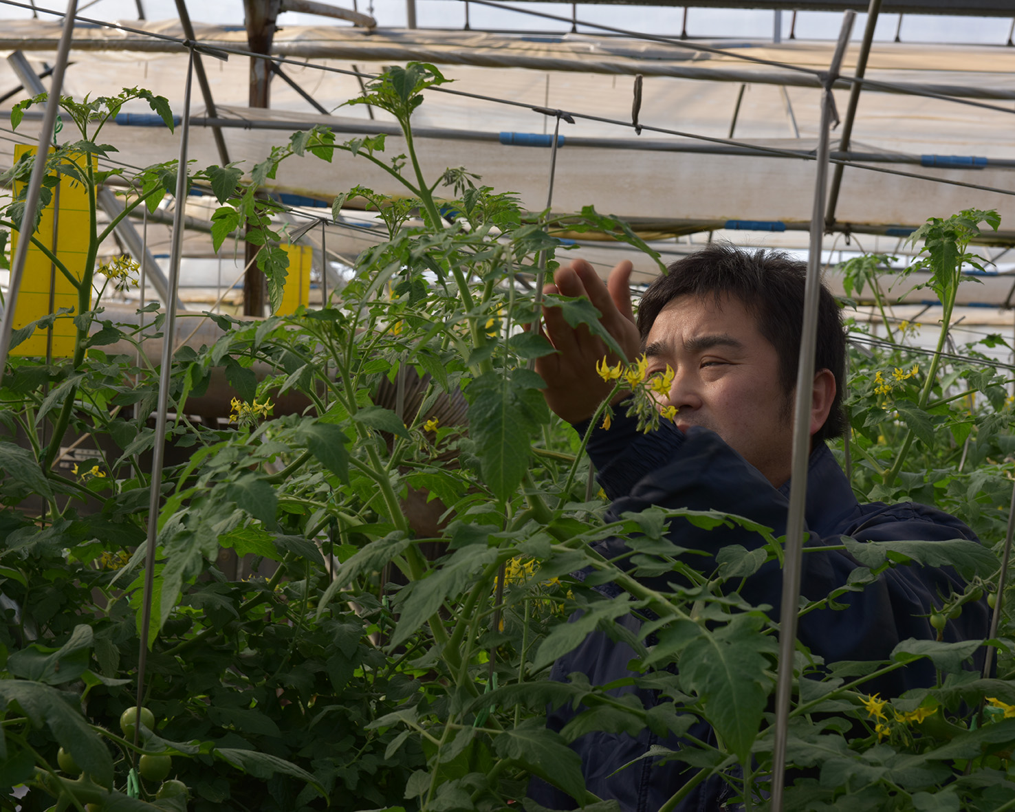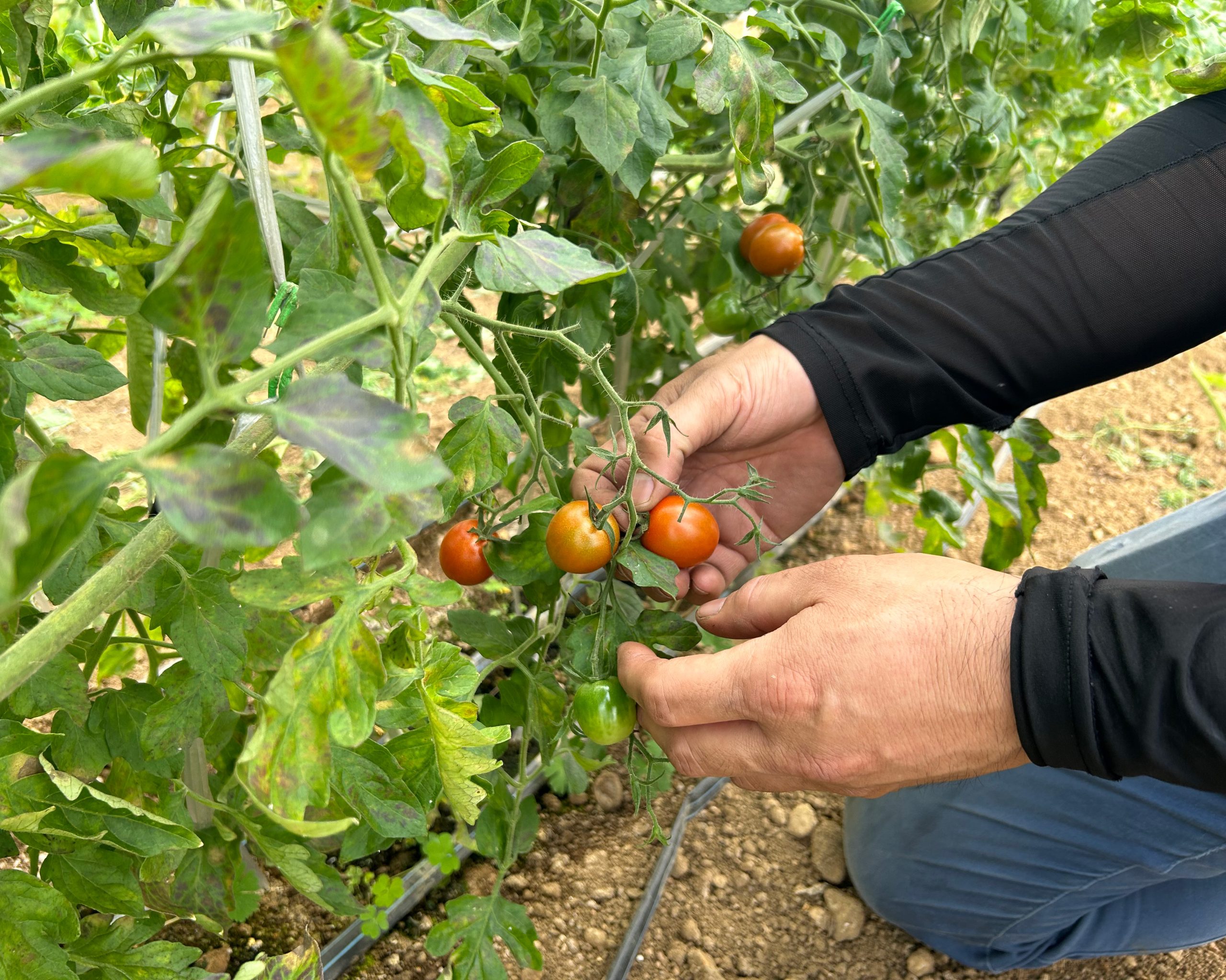 毎日の生育状況確認は欠かせません。ミニトマトの樹や葉の状態や病害の発生具合などを確認して、追肥や防除などの必要なメンテナンスを行っています。