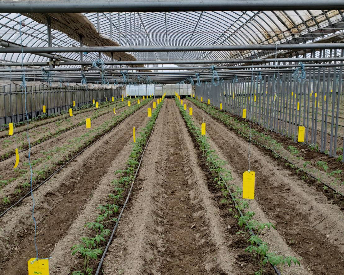 水分量を調節することのできる潅水チューブを使って必要最低限の潅水を行います。それにより果実にストレスがかかり、糖分と旨みが凝縮された味の濃いトマトに育ちます。