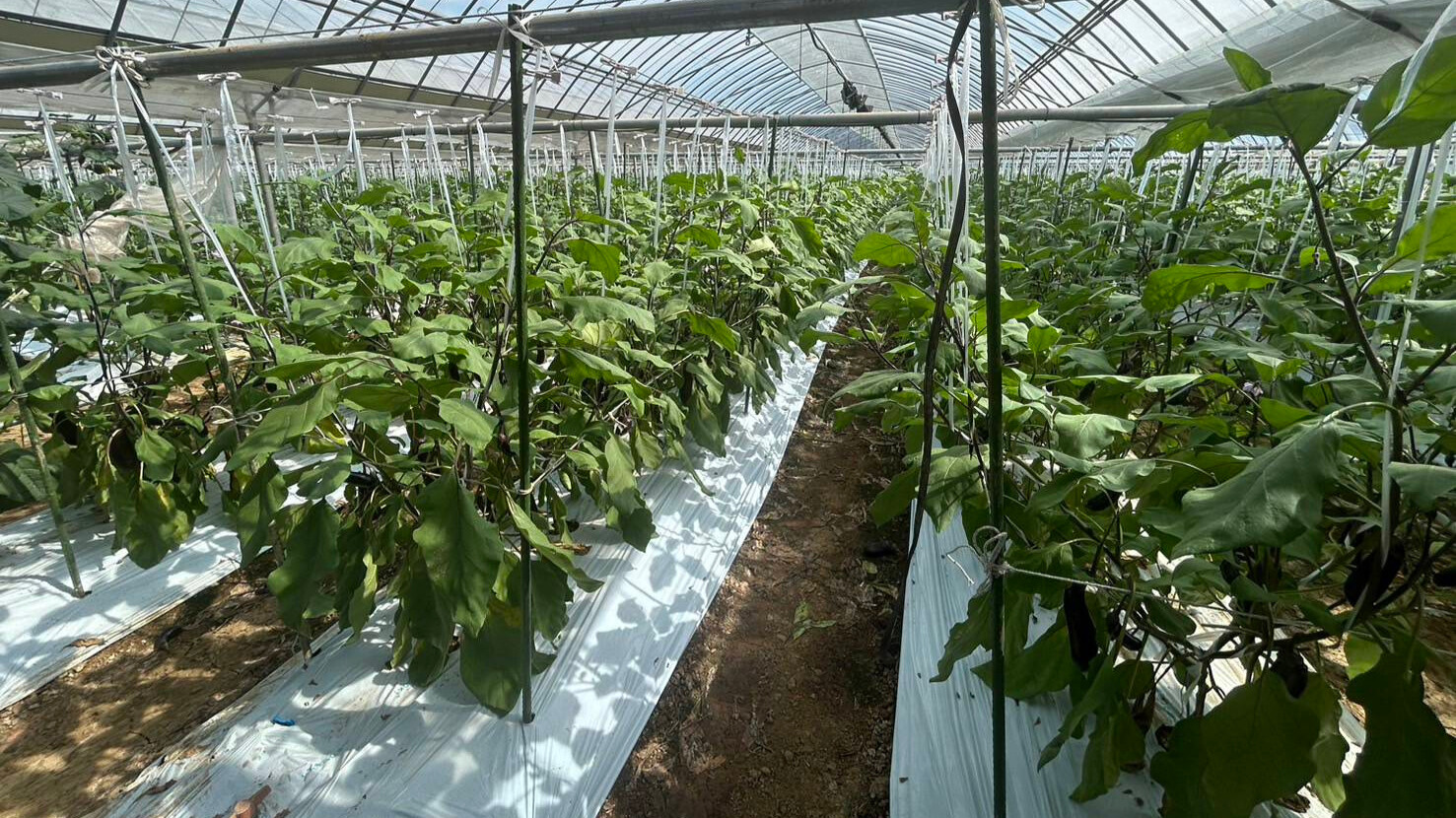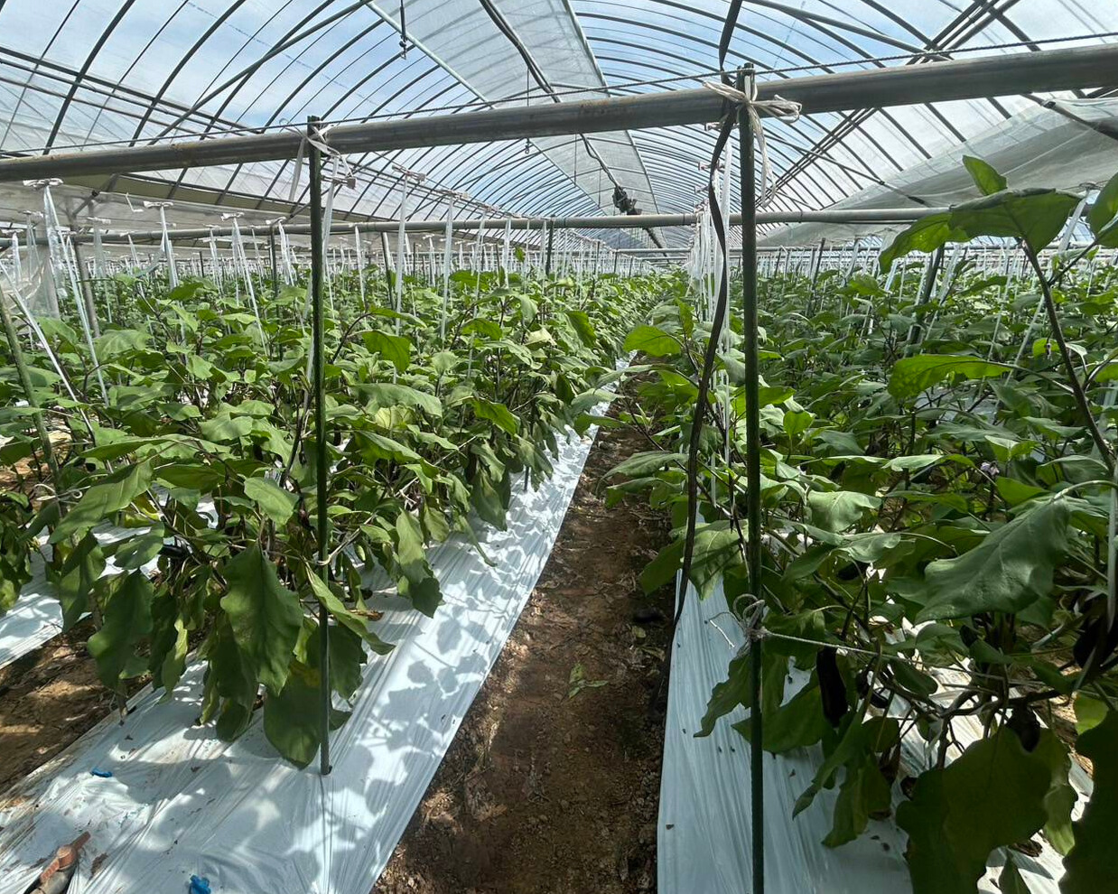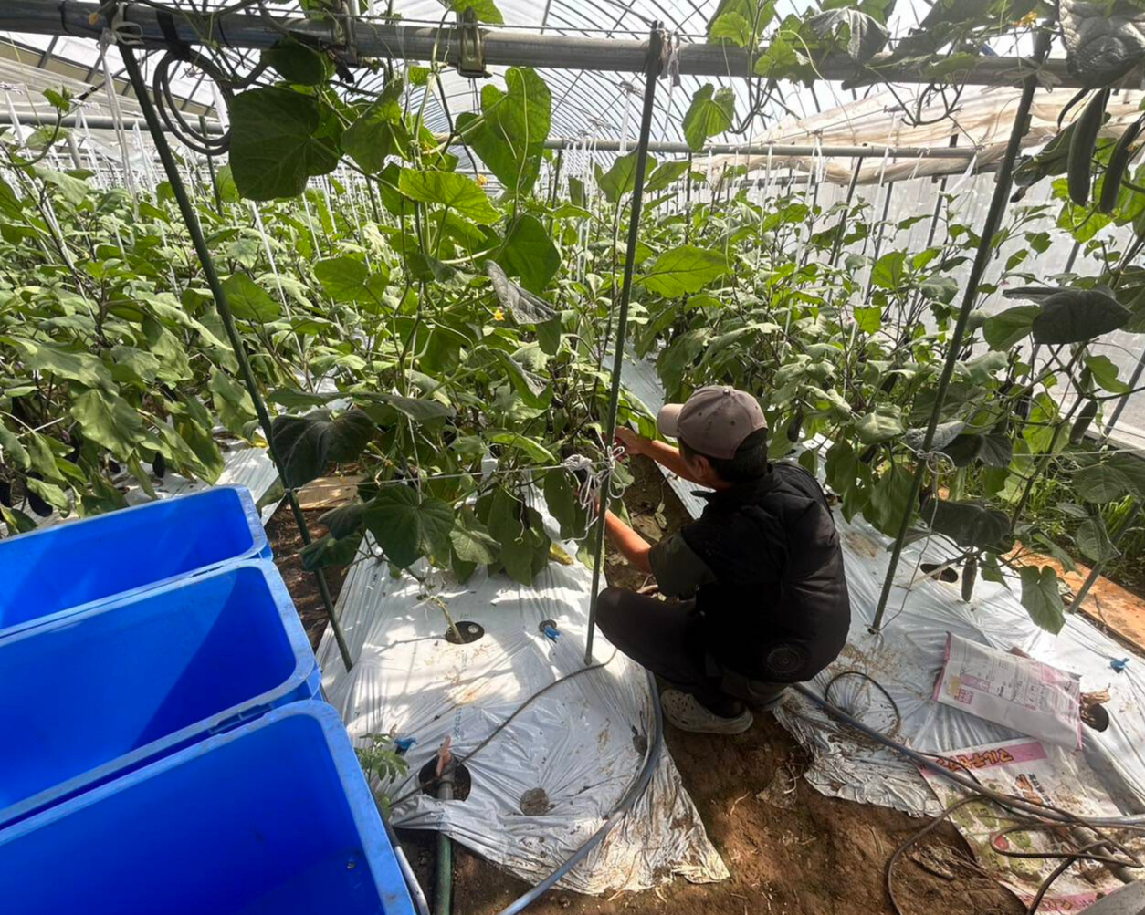 長なすは乾燥に弱く、根が縦に深く伸びることから水分の多い土壌を好みます。定植した苗の根がしっかりと根付くまでの間は、表面が乾かないように手作業で潅水を行います。根付いた後は、潅水チューブを利用し、水分量を調整していきます。