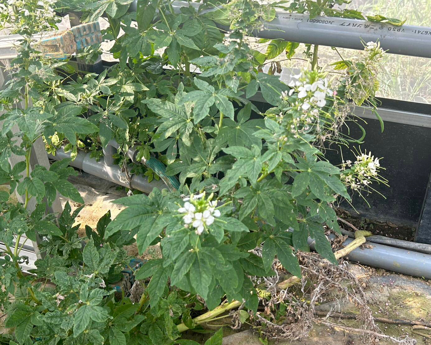 定植が完了した後、害虫対策のために天敵を導入します。ビニールハウス内にクレオメという植物を植えると、コナジラミの天敵であるタバコカスミカメという虫が付くことで、農薬を使用しない害虫対策になります。