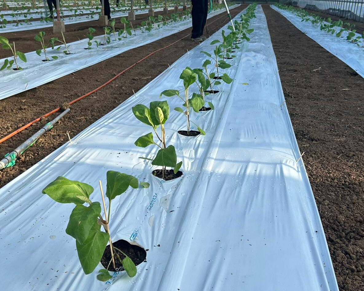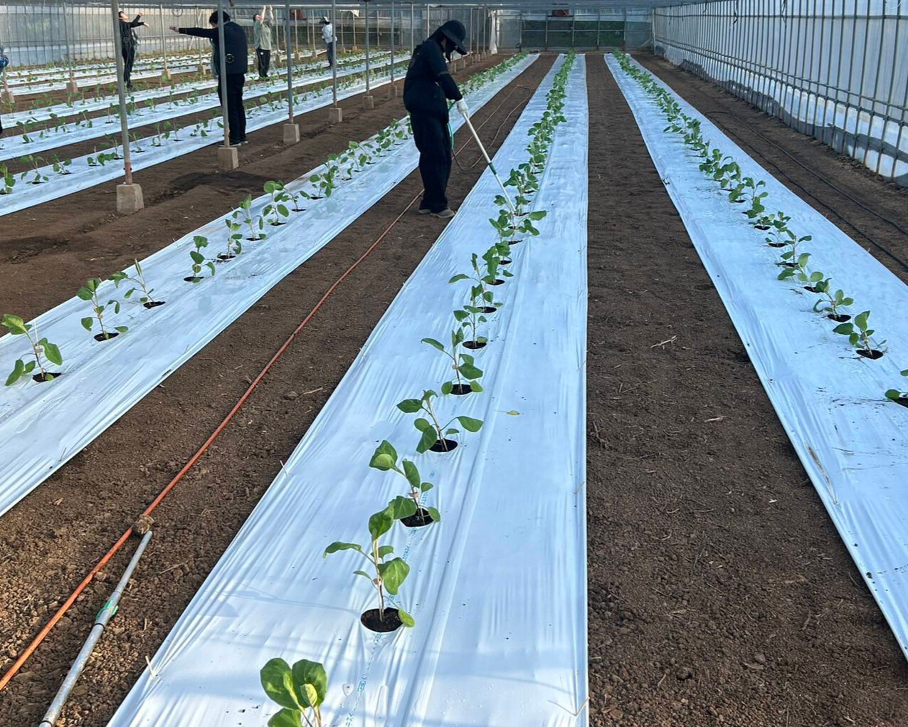 有機質肥料をたっぷり使用し、土づくりを行います。土づくりの後、マルチシートを張り、病害虫の発生を防いだり、雑草の防除をしたりなど長なすの栽培に良い環境作りをしていきます。その後、元気に育った苗を畑に植え付ける定植という作業を行います。