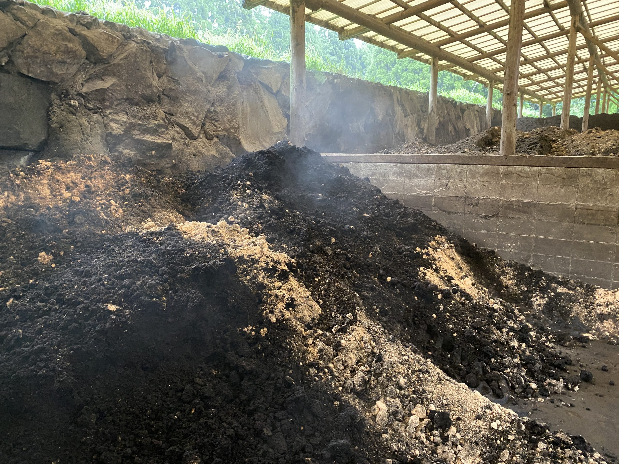 健康家族では、農産物の栽培には土づくりが非常に重要と考え、自社でこだわって作った「自家製完熟黒たい肥」を使用しています。自家製完熟黒たい肥は、牛フンに地元の稲わらを混ぜ込んで微生物の活性化を図り、じっくりと発酵させて作っています。