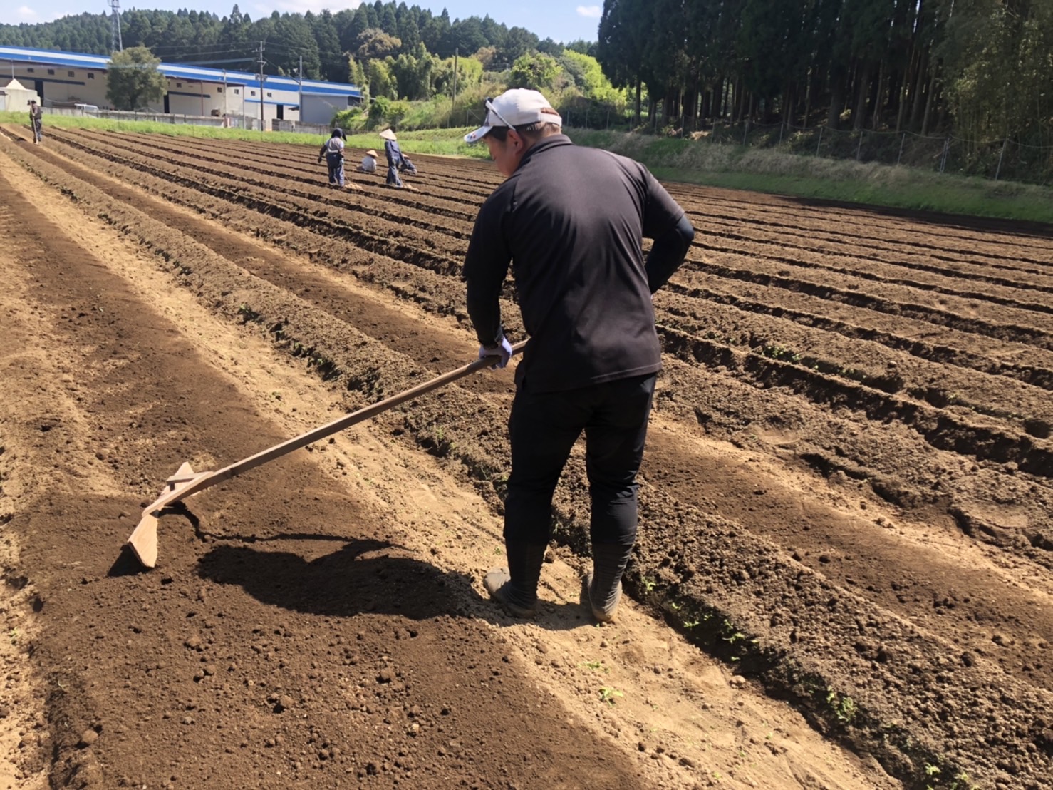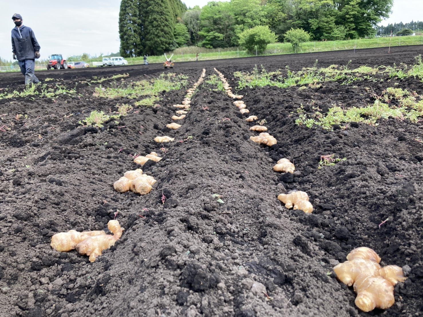 自家製完熟黒たい肥を使用して、土づくりをした後は植え付け作業になります。親となる種生姜を畑に等間隔で並べて、土上げを行います。