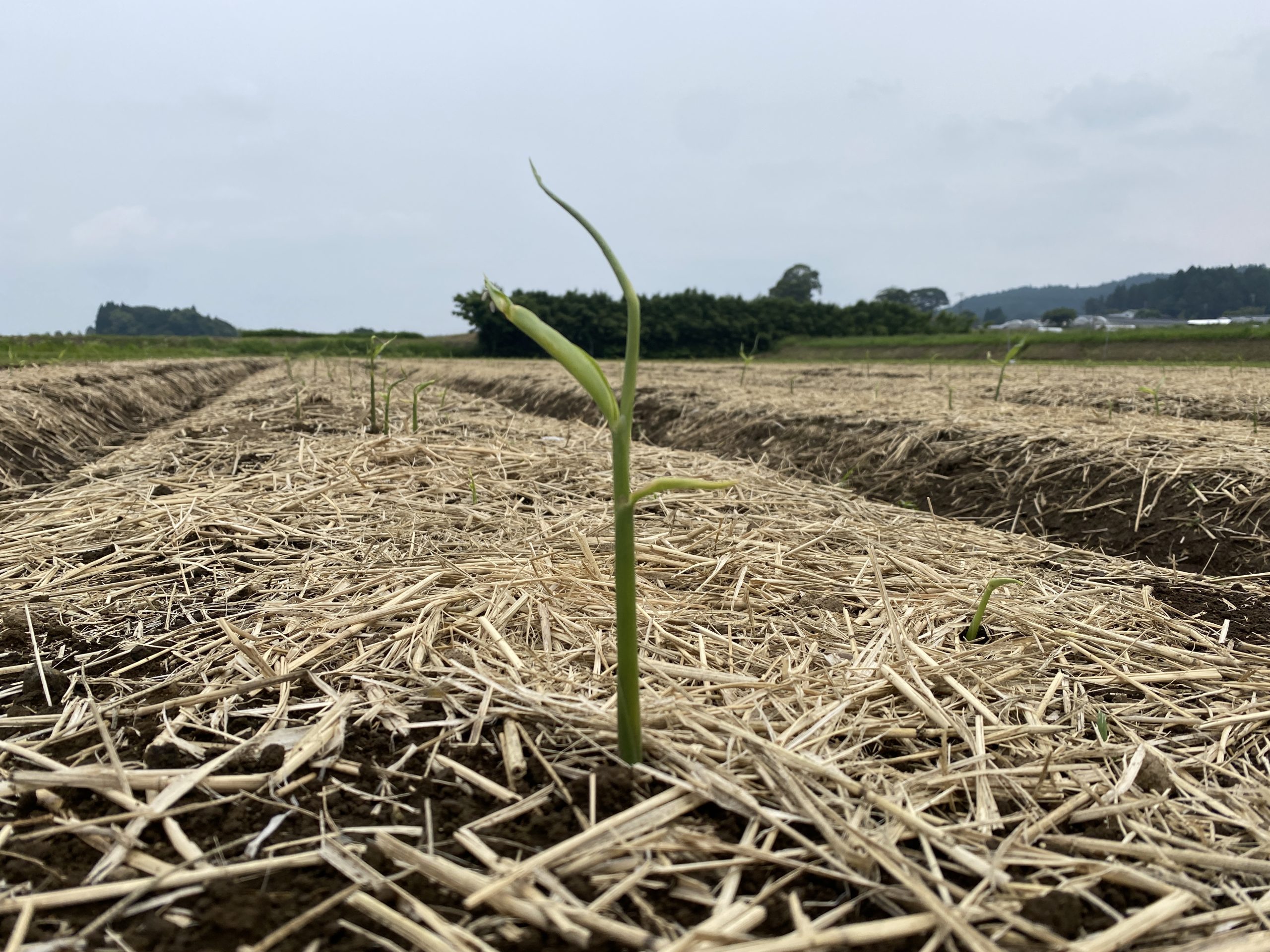 土壌が乾燥しないように、畝へ稲わらを敷きます。稲わらを敷くことで、土壌から水分が蒸発しないように抑えてくれたり、直射日光で土壌が高温になるのを防ぐ働きがあります。