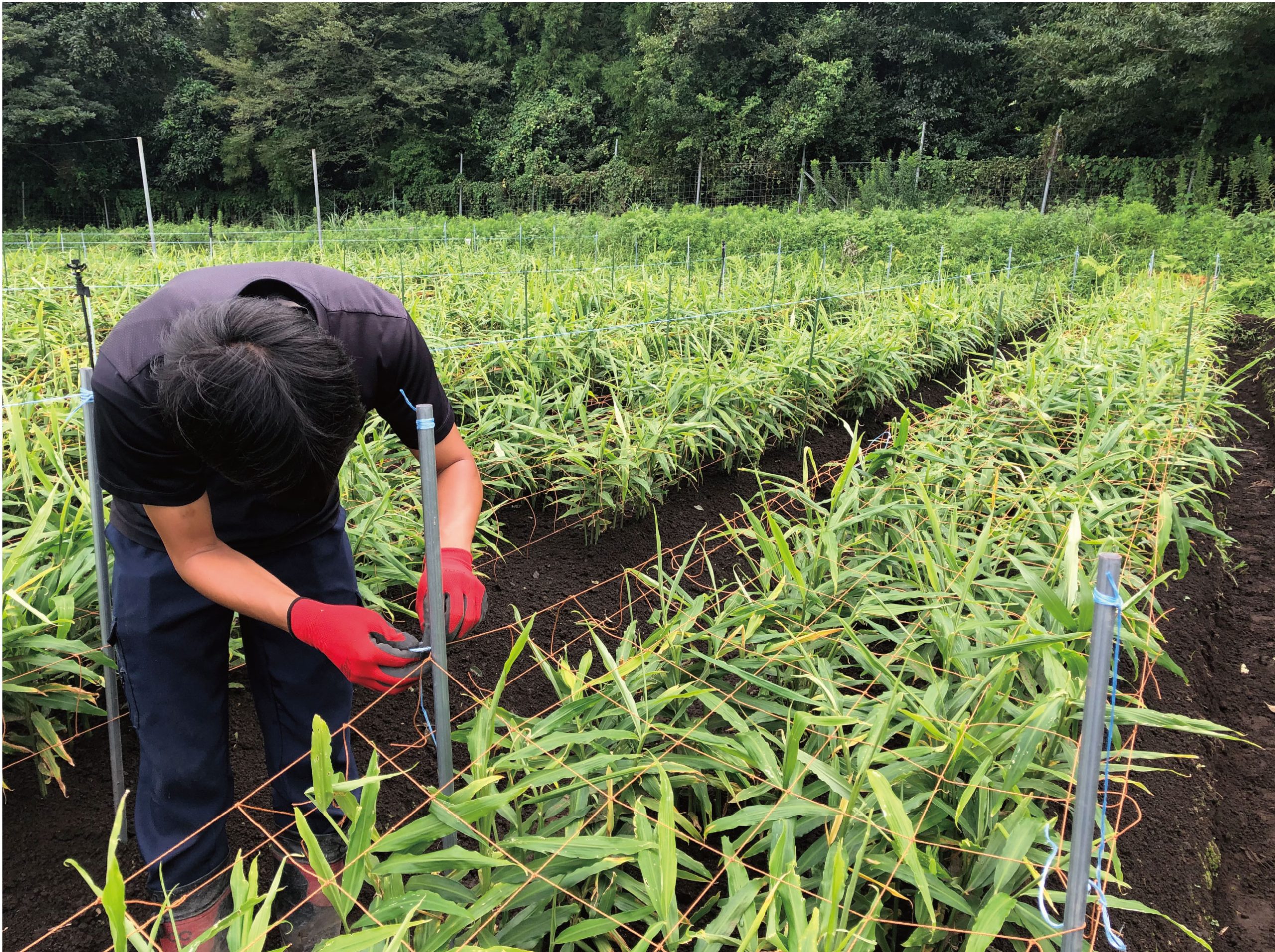 生姜は風に揺らされることで傷ができ、そこから病気が拡がってしまうことがあります。強風対策として防風ネットを張り巡らし、茎や葉が折れないように管理しています。
