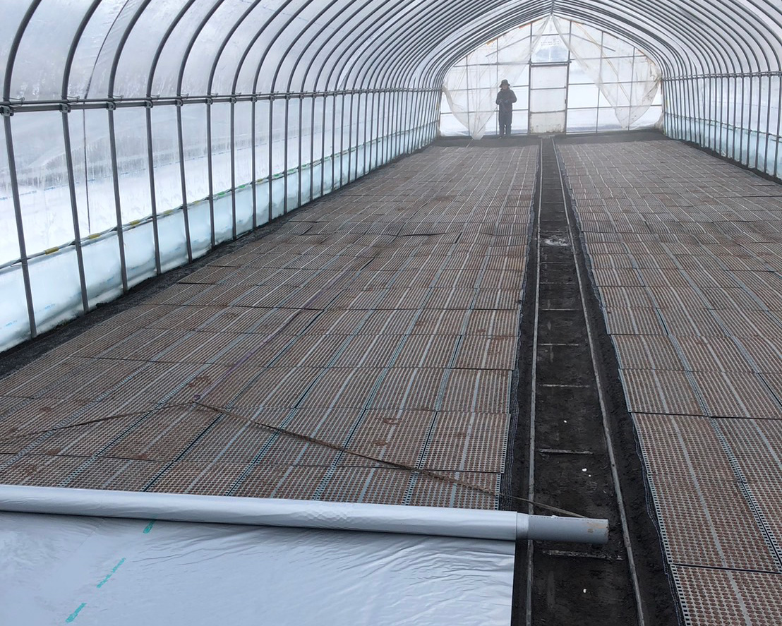 雪が残る2月下旬から播種作業が始まります。育苗用トレーに種をまき、ビニールハウス内に並べて、たっぷりと水やりを行います。発芽するまでの間は、表面が乾燥しないようにシルバーポリというフィルムで覆い、上からビニールをトンネル状に覆います。