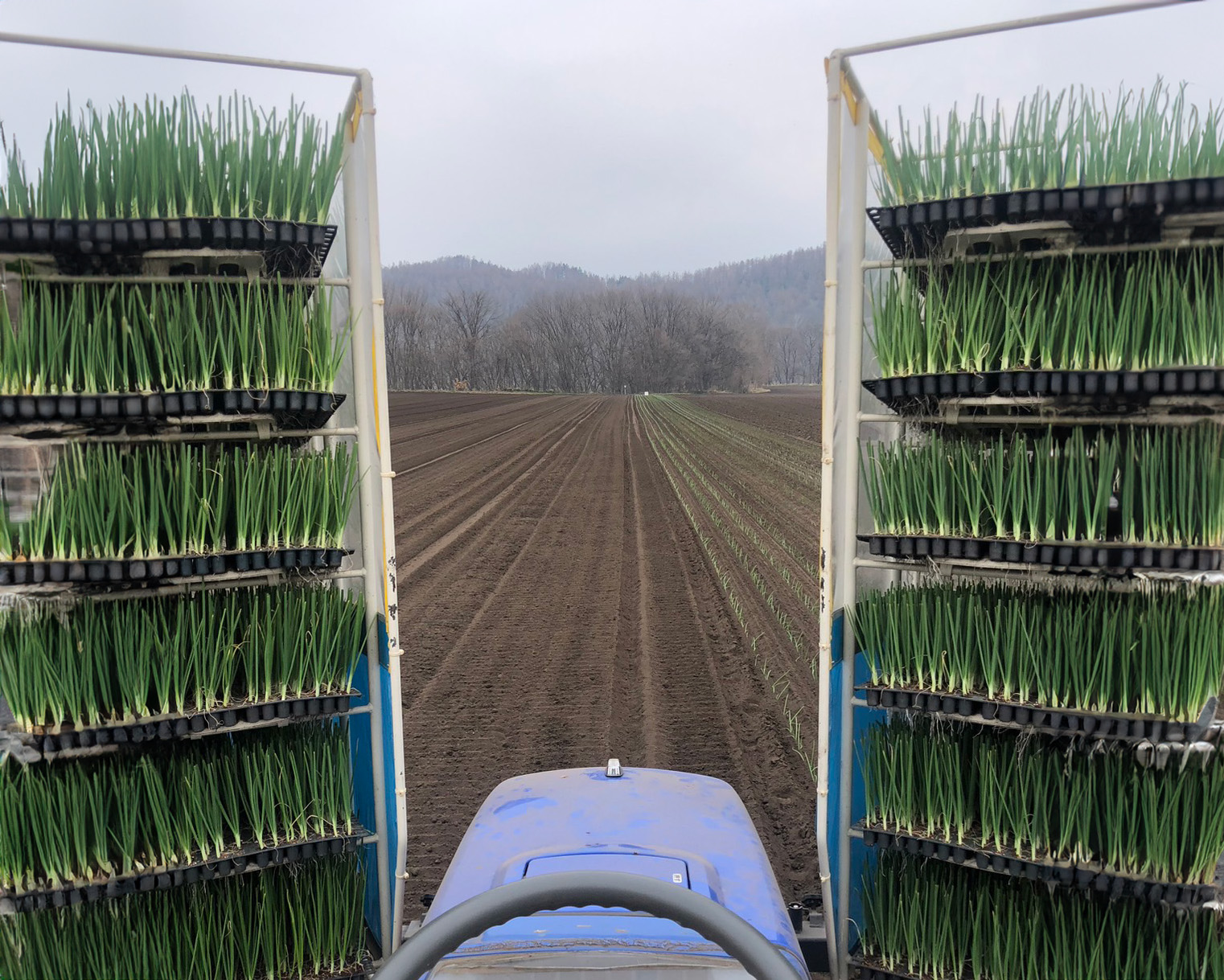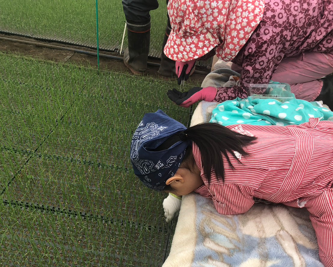 苗づくりの後、畑に定植していきます。葉の部分を15センチに切り揃えて、前日にたっぷりと水やり行って定植をします。機械での定植をした後に、苗が抜けている箇所や小さい苗を植えかえる補植の作業を行います。