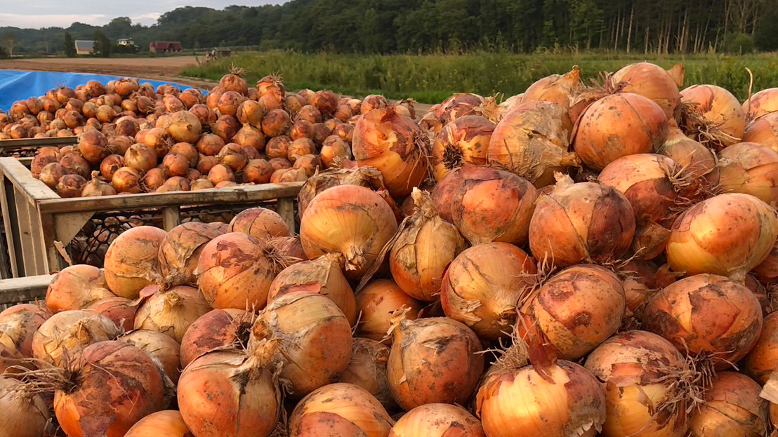 収穫した玉ねぎを選別していきます。変形しているもの、皮が剥けすぎているもの、傷んでいるものを取り除きます。選別をした後は、選果機という専用の機械でサイズ別に分け、出荷用の箱へ玉ねぎを詰めていきます。