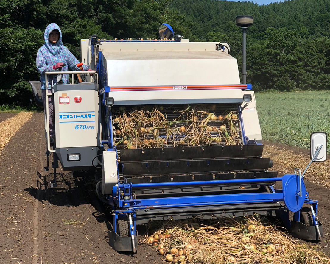 玉ねぎの葉が倒れる現象を倒伏(とうふく)といいます。倒伏は、玉ねぎが成熟して、収穫期に近づいた合図。倒伏した後は、機械で根切りの作業を行い、葉が乾燥してきたらハーベスターという収穫専用の機械で収穫を行います。